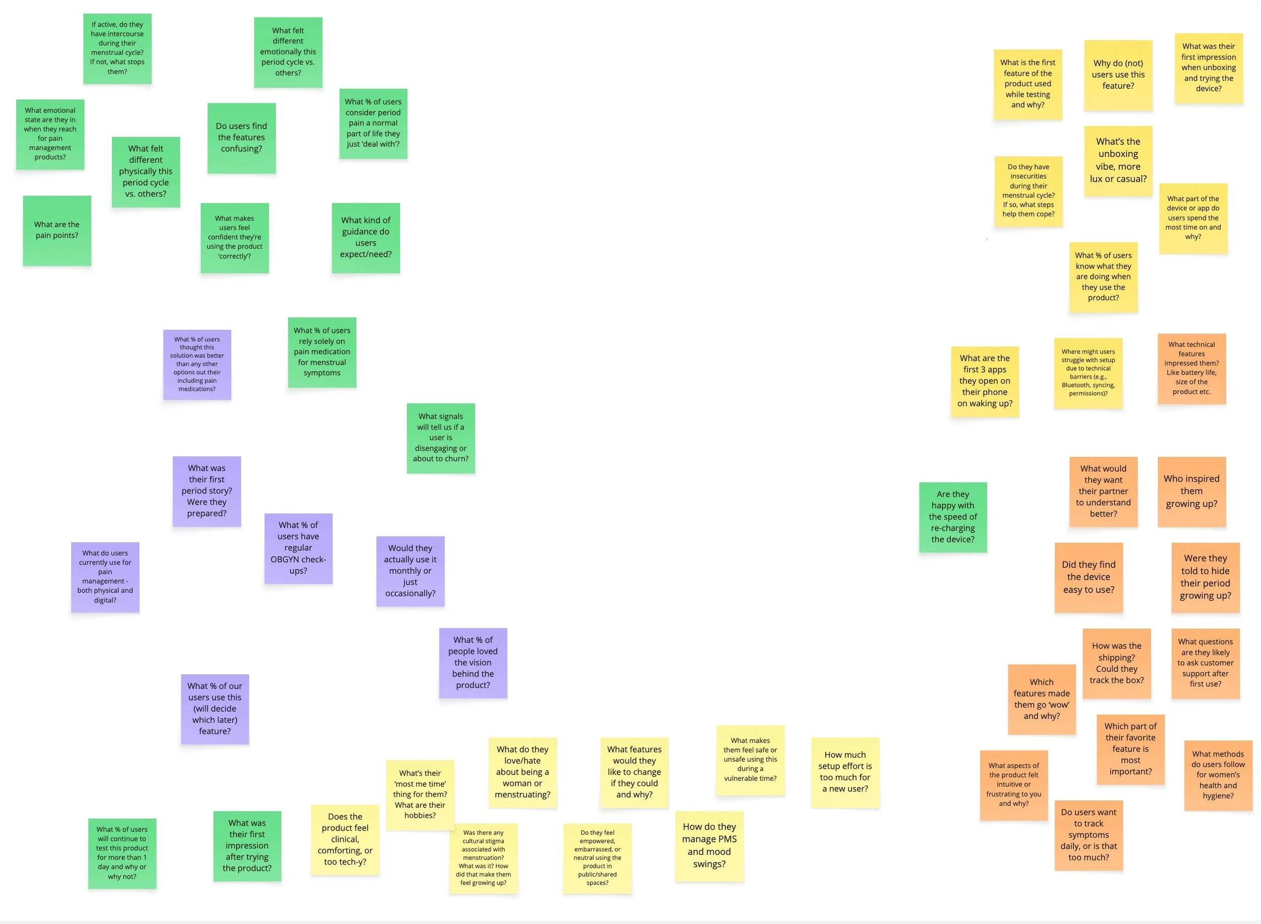 Our brainstorming session concluded with Unstructured, Natural, Direct questions as the top priority — validating our decision to conduct 1:1 interviews post–product trial. I then led participant recruitment with Product and Sales, sourcing women in our target age group from diverse backgrounds to reflect varied lifestyles and purchasing behaviors. Each participant received a short list of pre-read prompts to ground the discussion.